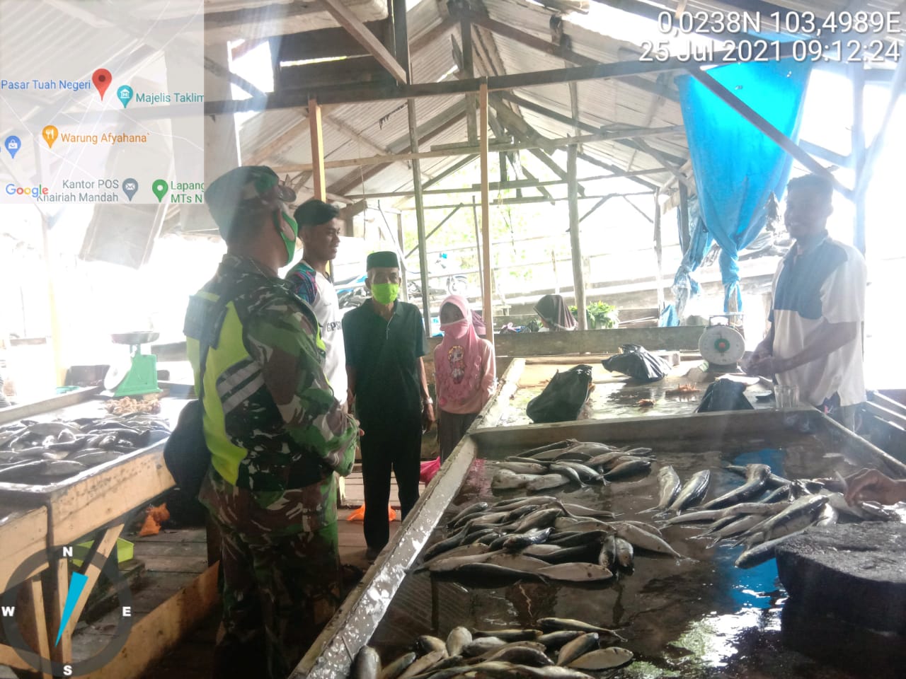 Serda Erik Arianto Sibarani Babinsa Koramil 08/Mandah Kodim 0314/Inhil menghimbau Pedagang di Pasar Kantin Ikan Penuhi Protokes