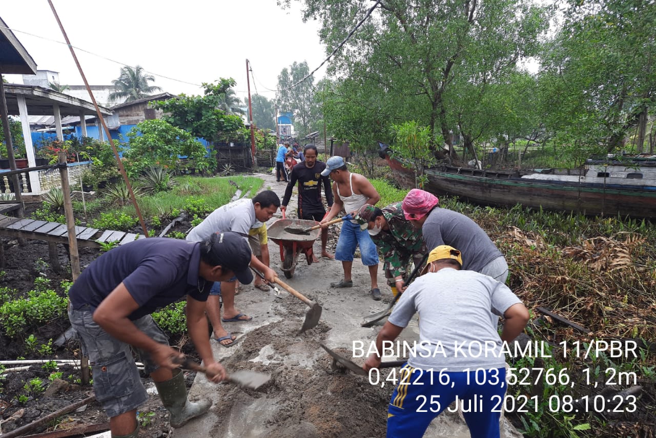 Sertu Yanuarsyah Babinsa Koramil 11/Pulau Burung Kodim 0314/Inhil Gotong Royong Perbaikan Jalan Warga