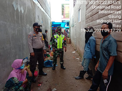 SERIBUPARITNEWS.COM,GAUNG - Guna mencegah Penyebaran Covid - 19 , Babinsa Koramil 05/Gas, Serka Sasmito bersama Babinkamtibmas terus melaksanakan penegakan disiplin protokol kesehatan kepada warga sekitar dan Pedagang di Hari Pasar menjelang Idul Adha Senin (19/07/2021)