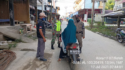 Seperti yang telah dilaksanakan Serda Surya Wibowo dab Praka Bobi salah satu Babinsa Koramil 07/Reteh Kodim 0314/Inhil melaksanakan melaksanakan protokol kesehatan dalam melakukan aktivitas diluar rumah untuk tetap memakai masker, jaga jarak dan cuci tangan dalam rangka penegakan disiplin untuk memutus penyebaran Covid-19 yang dilaksanakan oleh tem satgas covid 19 Kecamatan Reteh yang terdiri dari Anggota Koramil 07/Reteh Anggita Polsek Reteh dan Sat Pol PP Kecamatan Reteh.