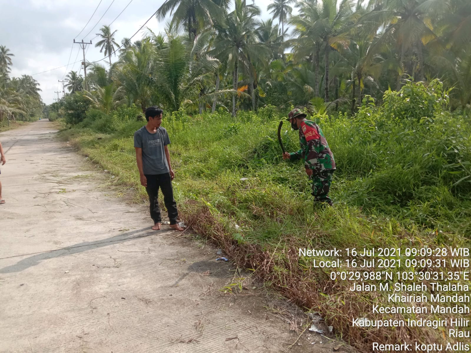 SERIBUPARITNEWS.COM, TEMBILAHAN - Seperti Kegiatan yang sudah sudah, di Jumat Pagi ini Babinsa Koramil 08/Mandah Kodim 0314/Inhil, Koptu Adlis melaksanakan kegiatan Goro pembersihan kanan kiri jalan umum (16/07/2021)