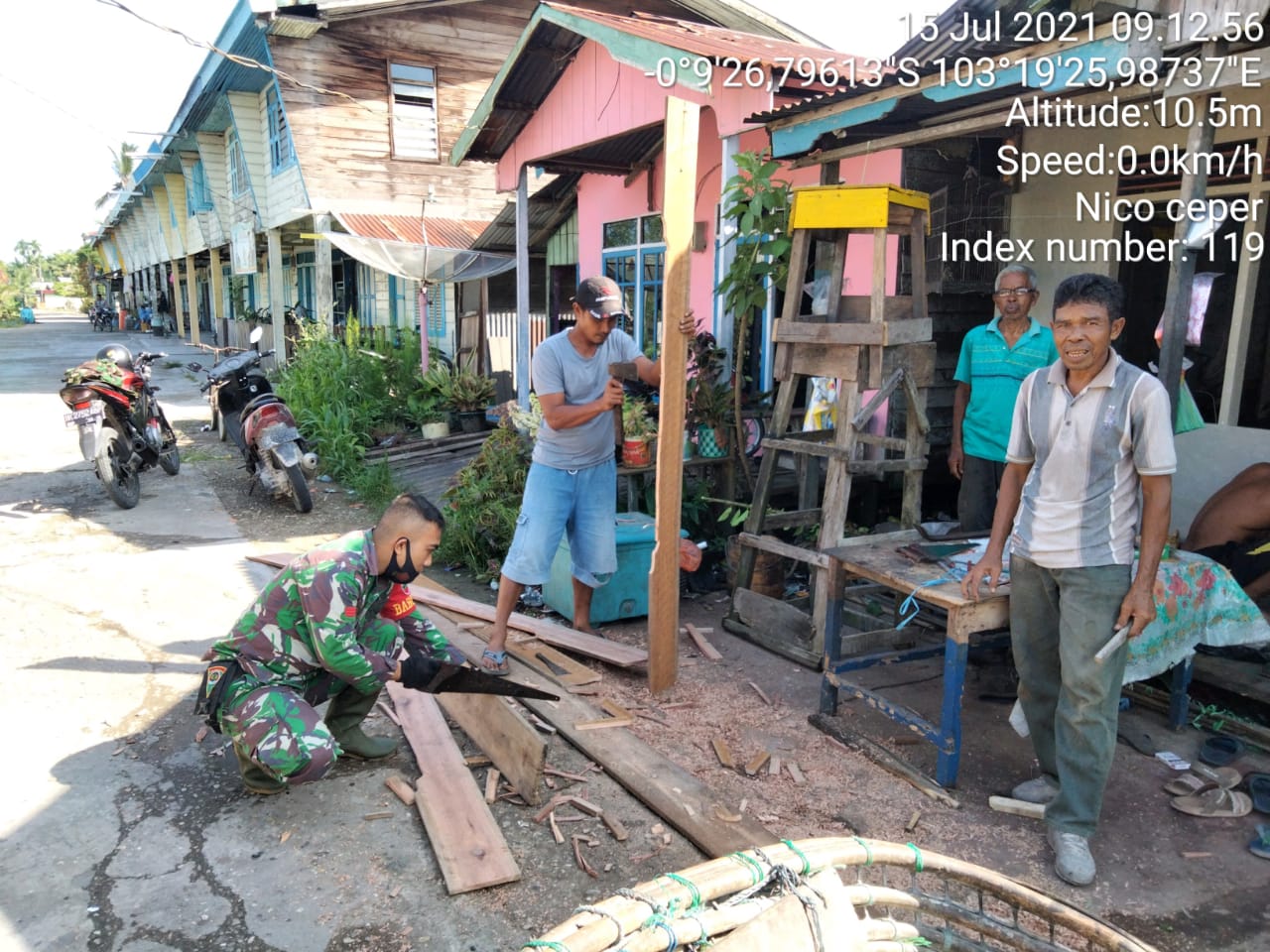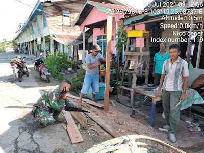 Hari ini Babinsa Koramil 05/Gas Kodim 0314/Inhil Praka Nico Rashwadi atau Rico Ceper melaksakan program bedah rumah di Desa Teluk Pantaian