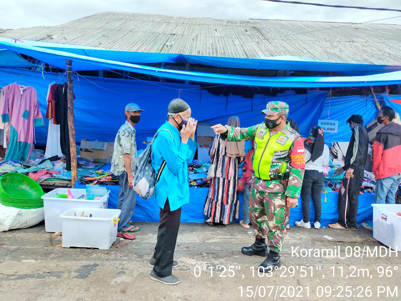SERIBUPARITNEWS.COM, MANDAH - Pasar Masih menjadi bagian dari Cluster penyebaran covid-19 yang potensial, oleh Karenanya Babinsa Koramil 08/Mandah Sertu Haris Moni terus  melaksanakan Penegakan disiplin protokol kesehatan covid serta sosialisasi dan himbauan aturan 5M kepada warga pengunjung di pasar tradisional Desa Bekawan Kecamatan Mandah Kab.Inhil Kamis (15/07/2021)