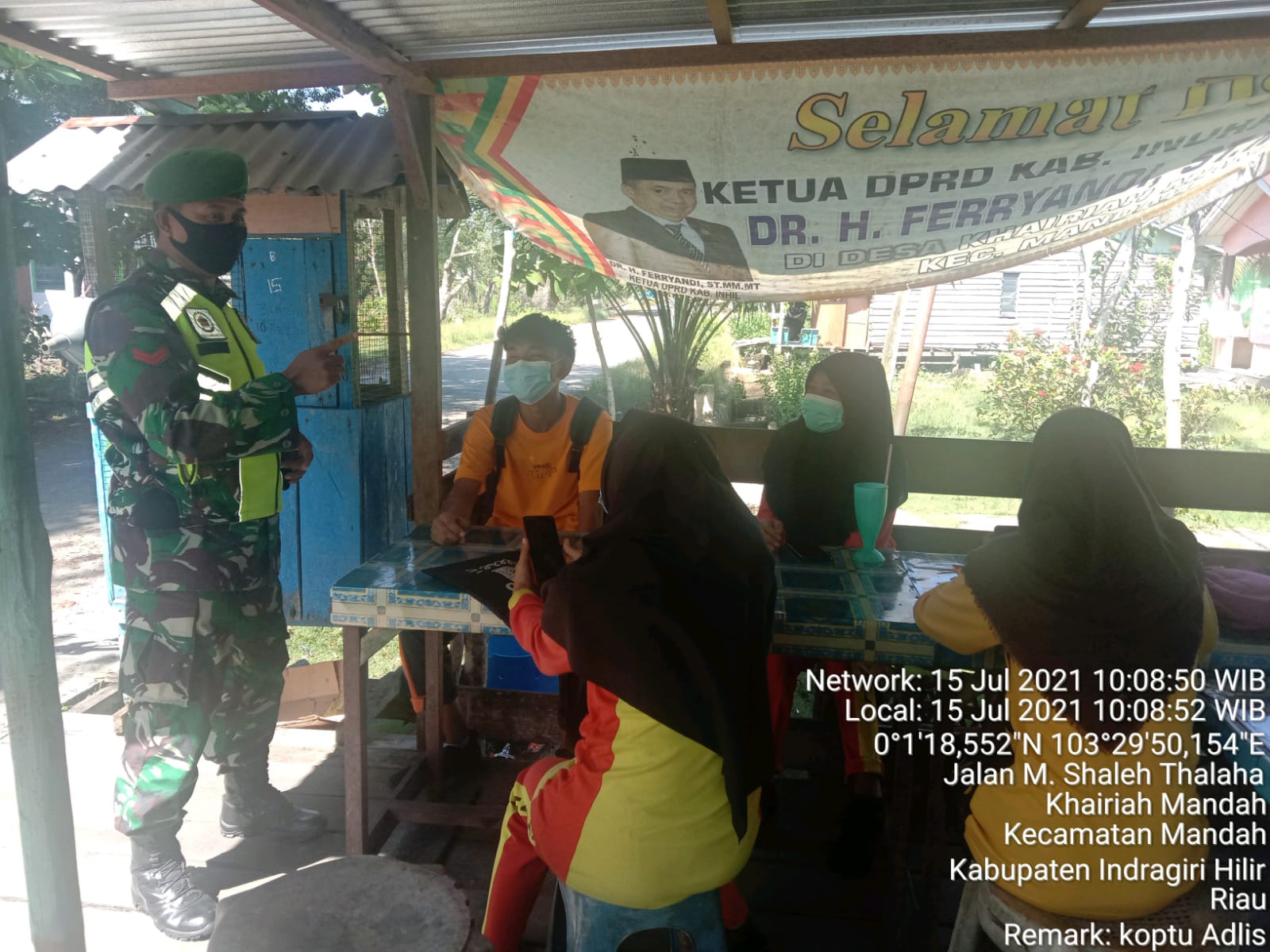 SERIBUPARITNEWS.COM, MANDAH - Dalam Upaya Pencegahan wilayah dari Pandemik Covid-19, Babinsa Koramil 08/Mandah Koptu Adlis terus  melaksanakan Penegakkan disiplin protokol kesehatan covid 19 Kamis  (15/07/2021)