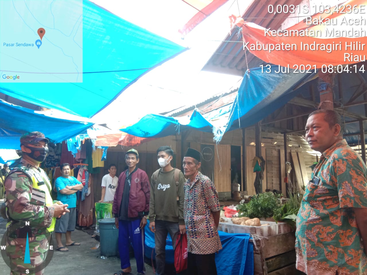 Babinsa melakukan sosialisasi kepada warga yang berkumpul di pasar Sendawa Desa Bakau Aceh Kecamatan  Mandah Kab Inhil. Agar tetap mematuhi protokol kesehatan