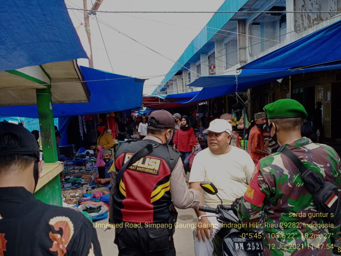 SERIBUPARITNEWS.COM, GAUNG - Peranan Apkowil sangat diharapkan terutama dalam pencegahan Covid -19,seperti hari ini Babinsa Koramil 05/Gas Serda Guntur melaksanakan penegakan disiplin protokol kesehatan kepada pedagang dan penjual di Pasar Desa Simpang Gaung Kecamatan Gaung Senin (12/07/2021)