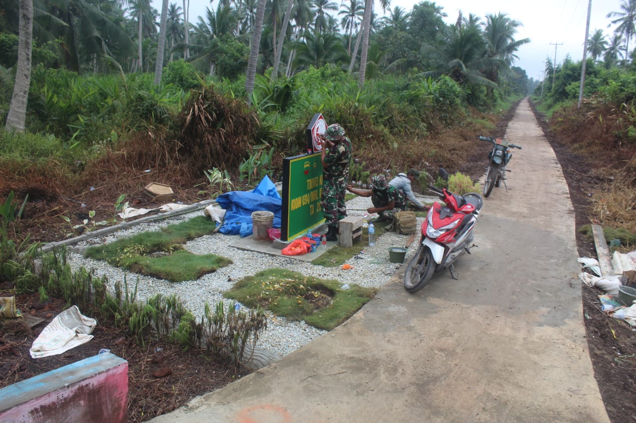 SERIBUPARITNEWS.COM,Indragiri Hilir, - Proses pengerjaan pembuatan tugu yang merupakan bukti telah diadakannya TMMD ke 111 Kodim 0314/lnhil yang dibangun di perbatasan Desa Terusan Beringin Jaya dan Desa Teluk Bunian, terus dikebut, Senin, (12/07/2021).