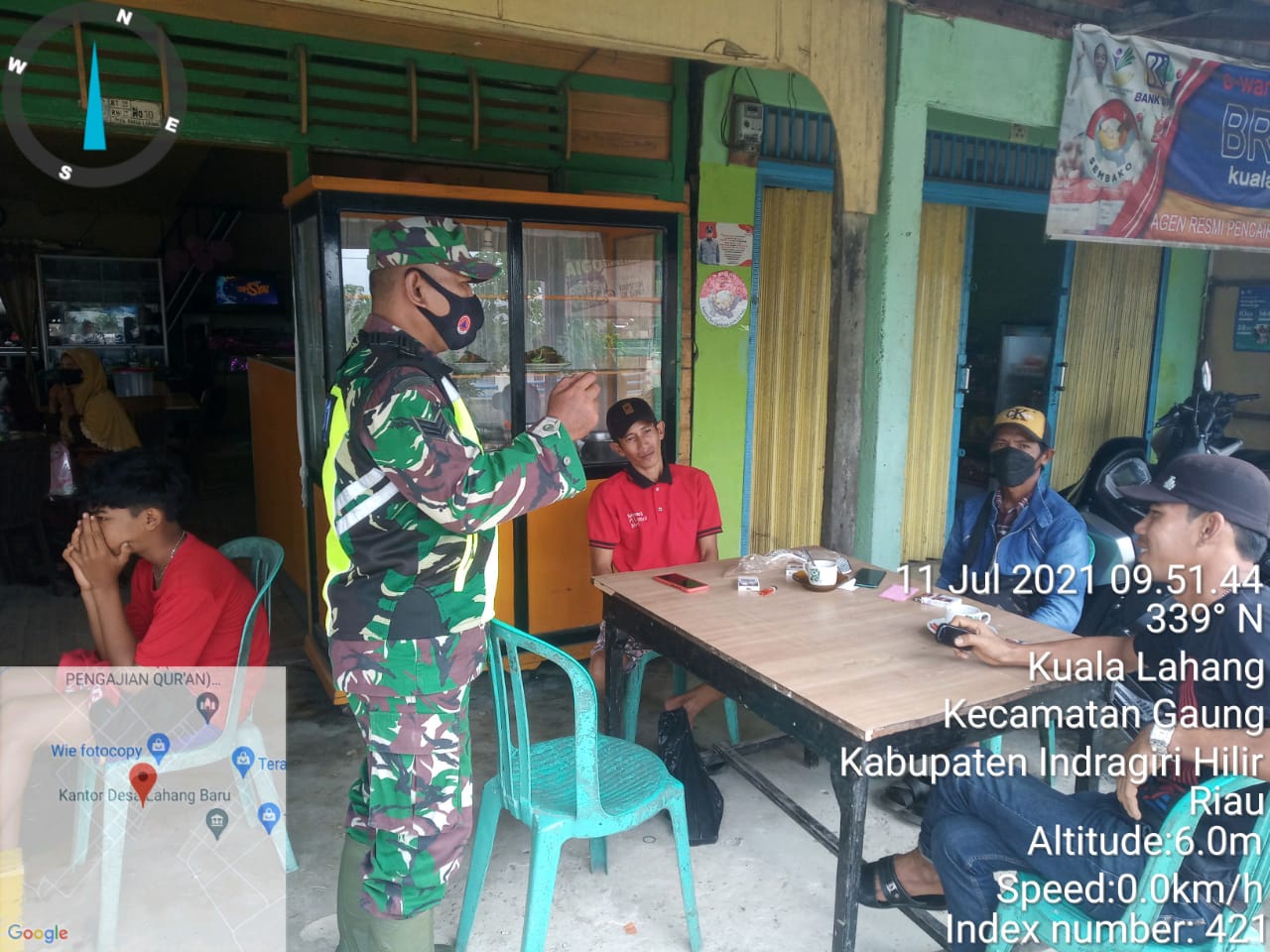 Serma Tota Simbolon melaksanakan penegakan disiplin protokol kesehatan kepada warga pedagang dan pembeli di salah satu kedai kopi di Kelurahan Kuala Lahang Kecamatan Gaung Minggu (11/07/2021)