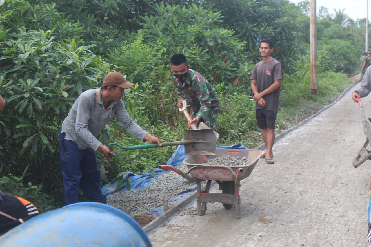 SERIBUPARITNEWS.COM, Indragiri Hilir, - Cuaca pagi yang cerah, menambah semangat gotong royong Satgas TMMD dengan masyarakat Desa Teluk Bunian yang sedang mengebut pekerjaan di sasaran fisik semenisasi jalan Yakub ll, Desa Teluk Bunian, Kecamatan Pelangiran, Kabupaten lnhil. Minggu, (11/07/2021).
