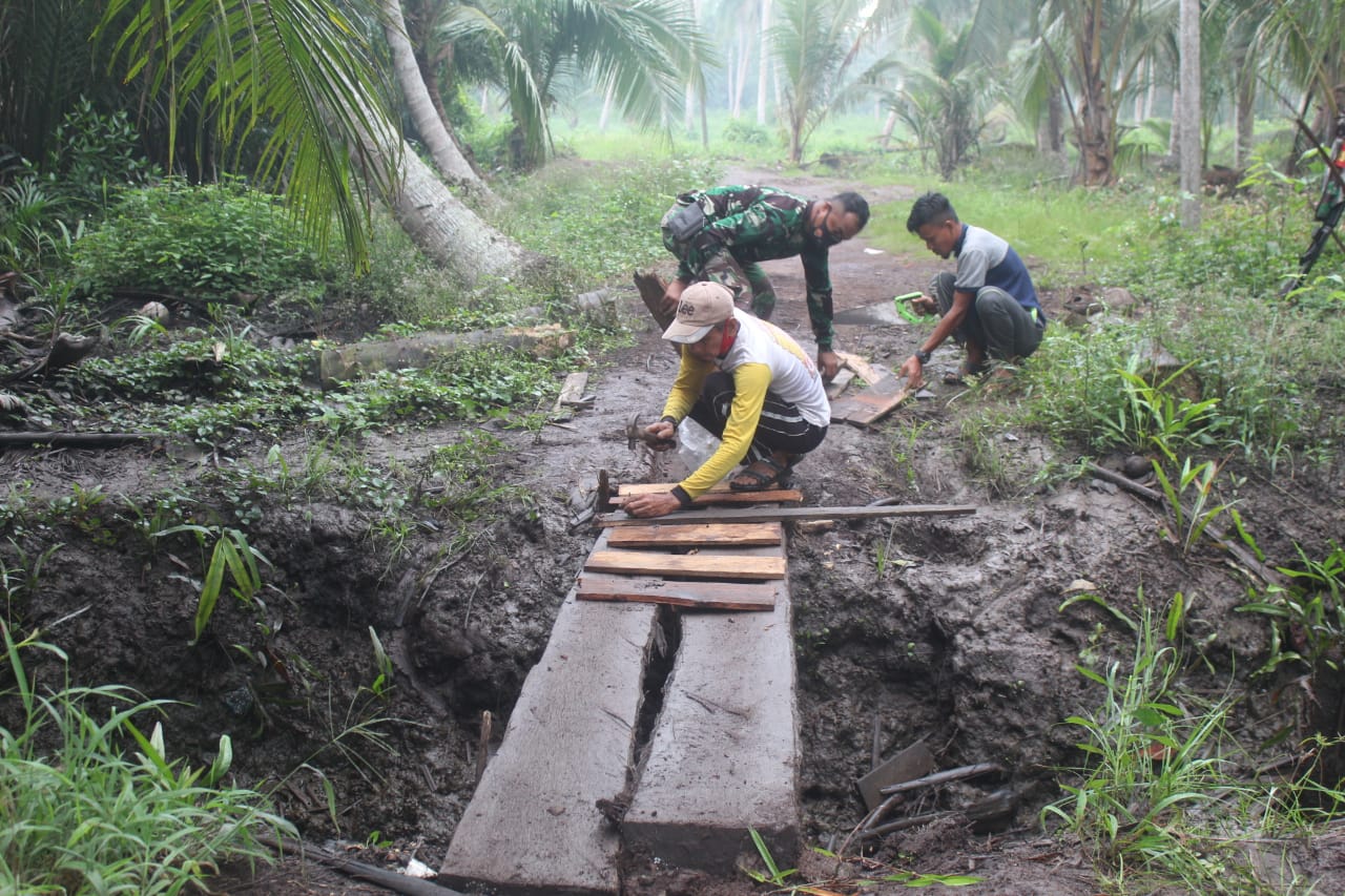 Selain bergotong royong di Surau Baitur Rahman, Satgas TMMD ke 111 juga melakukan gotong royong memperbaiki Jembatan kecil yang menyambungkan jalan menuju Dusun Teluk Pundur Hilir