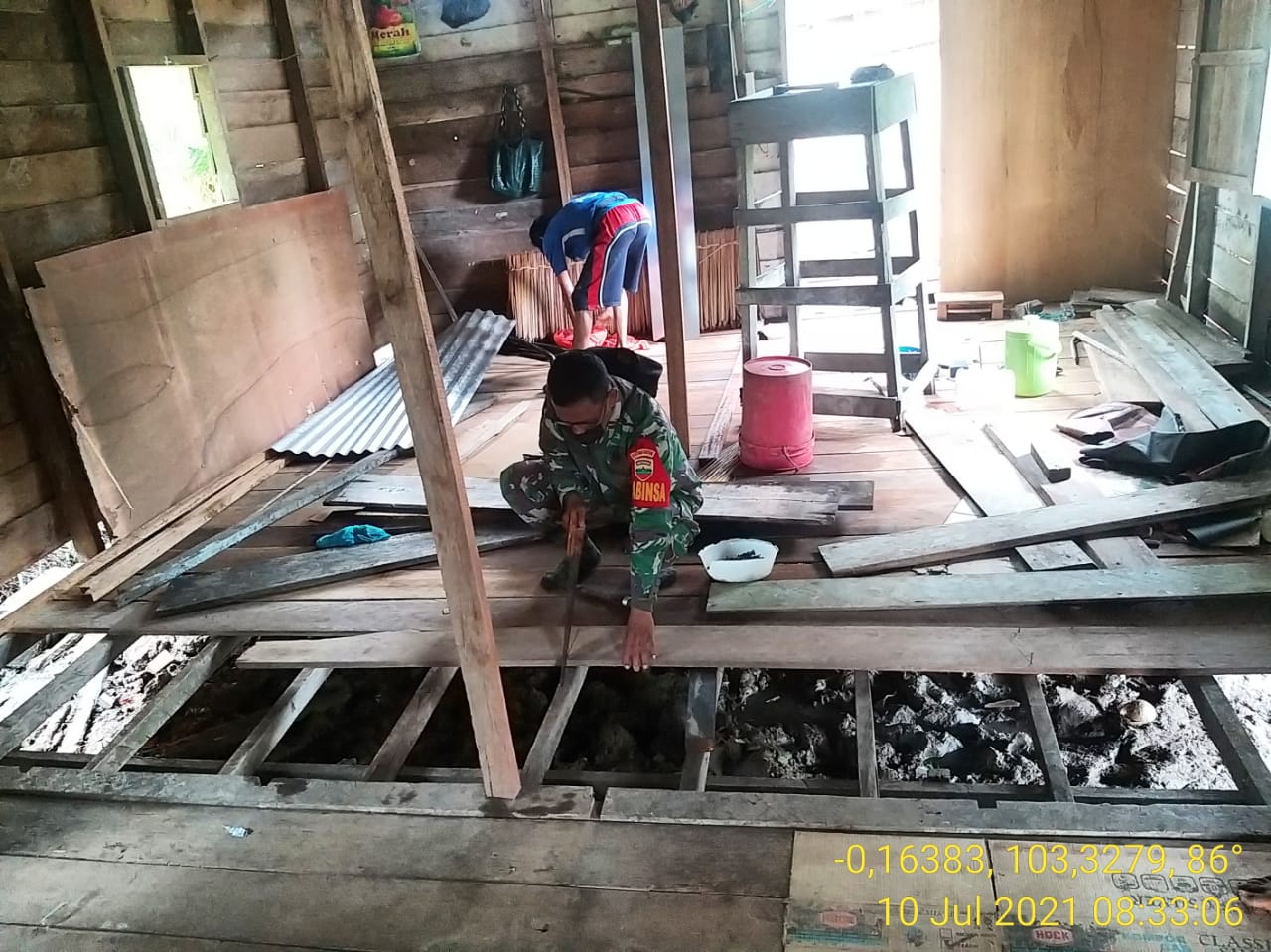Babinsa menyusun papan demi papan di paku supaya kuat di gelagar rumah kayu tersebut