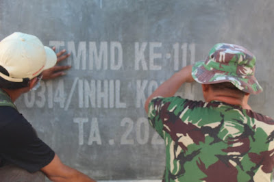 SERIBUPARITNEWS.COM, Inndragiri Hilir, - Hari demi hari proses pembuatan tugu TMMD semakin di kebut pengerjaanya. Hari ini di tugu TMMD ke 111 ini sudah terlihat tulisan tulisan yang terukir dari hasil pahatan Sertu Kin Satoto, perelief Kodim 0314/lnhil. Kamis, (08/07/2021).