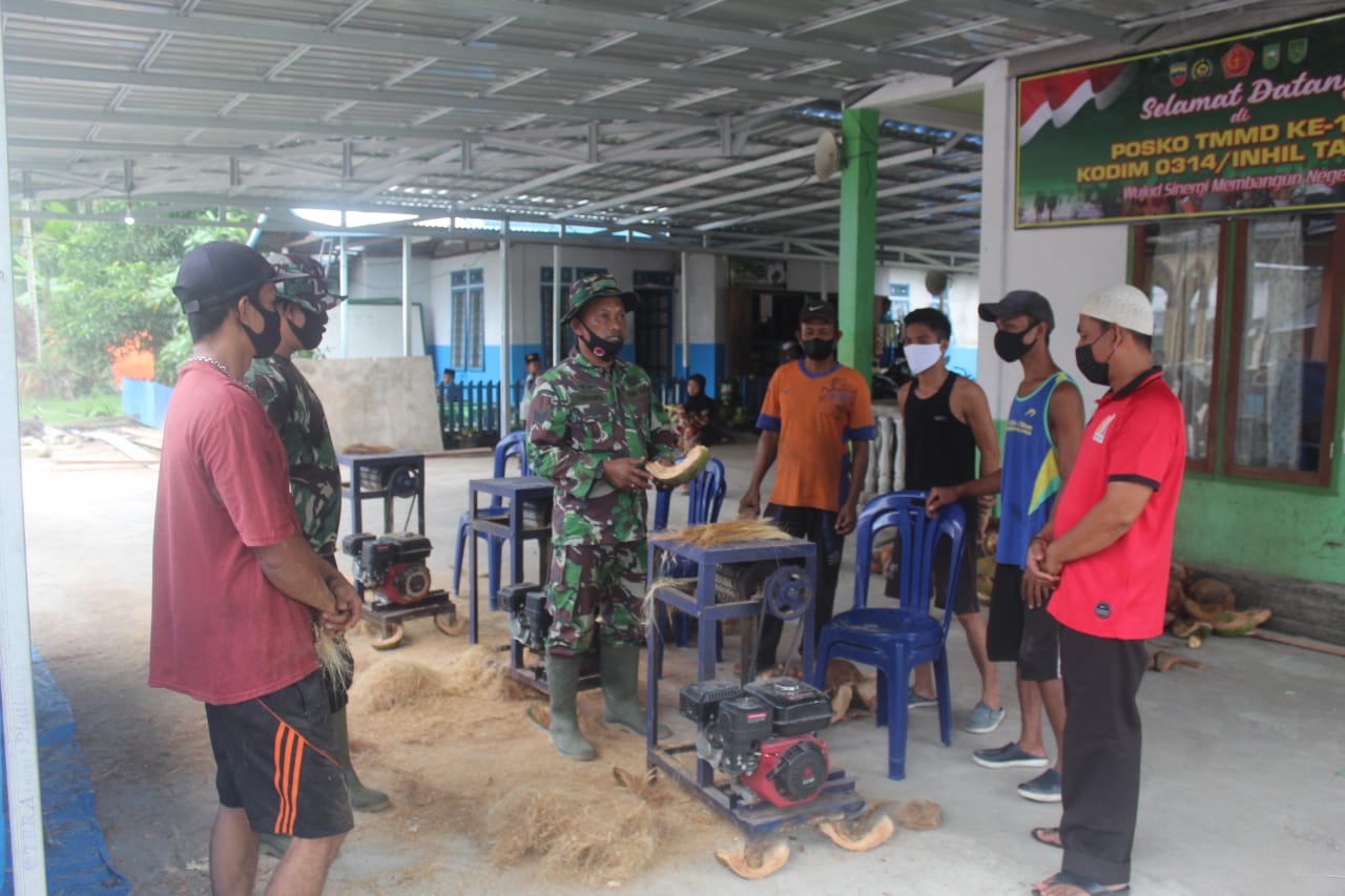 Di Motori oleh Serka Sugianto dan Serda Dedi Fitrika, hari ini Satgas TMMD melakukan sosialisasi pengolahan dan pemanfaatan sabut kelapa di Posko TMMD ke 111 Kodim 0314/lnhil.
