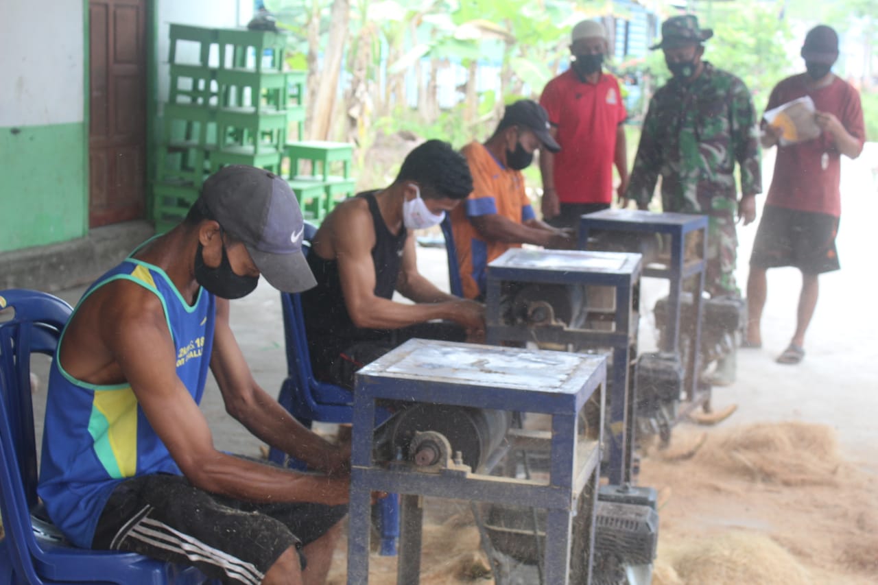 Di Motori oleh Serka Sugianto dan Serda Dedi Fitrika, hari ini Satgas TMMD melakukan sosialisasi pengolahan dan pemanfaatan sabut kelapa di Posko TMMD ke 111 Kodim 0314/lnhil.