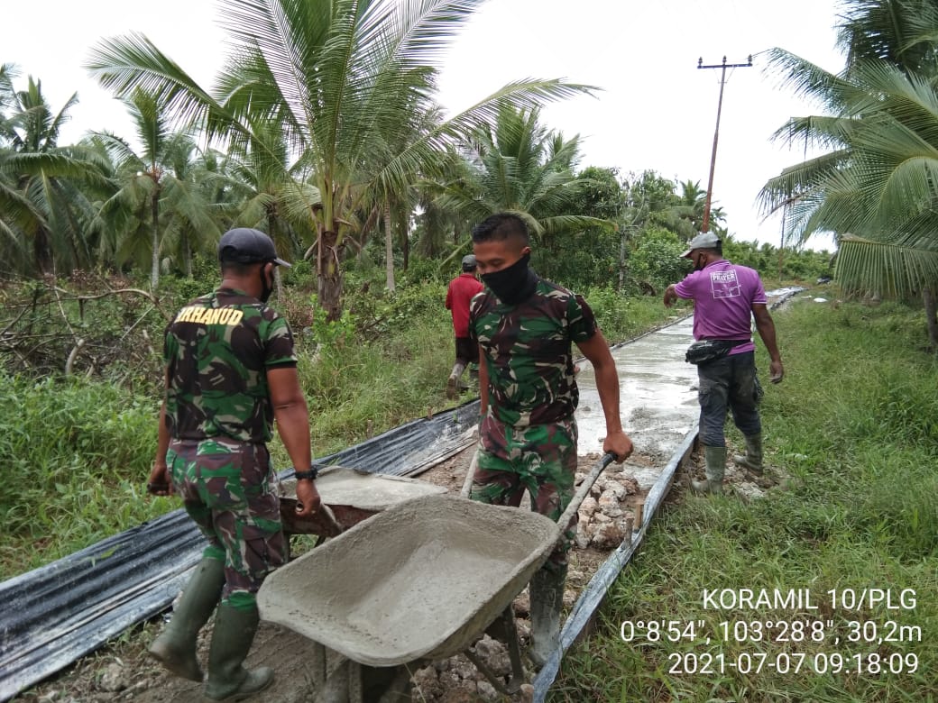 Babinsa tak pernah surut bersama satgas dalam mempercepat pekerjaan semenisasi jalan