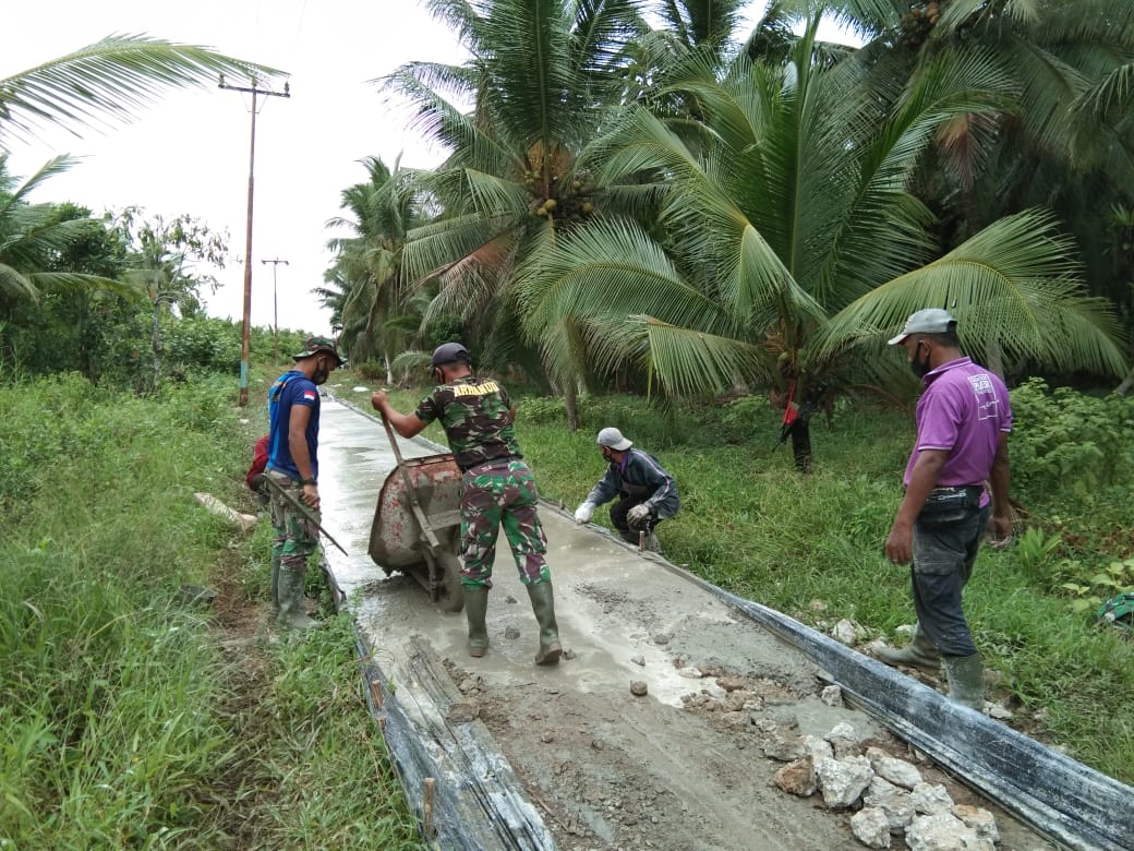 Satgas menghidupkan mesin molen dan memasukkan material dicampurkan dengan semen batu dan pasir diaduk kemudian dituangkan ke posisi jalan yang hendak cor