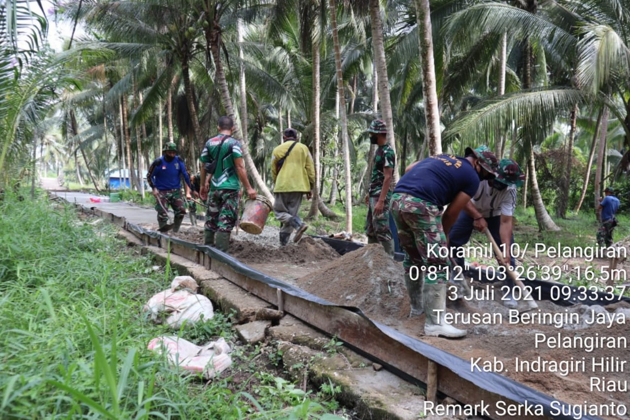 SERIBUPARITNEWS.COM, PELANGIRAN - Serka Sugianto Babinsa Koramil 10/Pelangiran bersama Satgas tmmd ke 111 bersama dengan warga desa terusan beringin jaya masih melaksanakan Kegiatan semenisasi jalan Sabtu (03/07/2021)