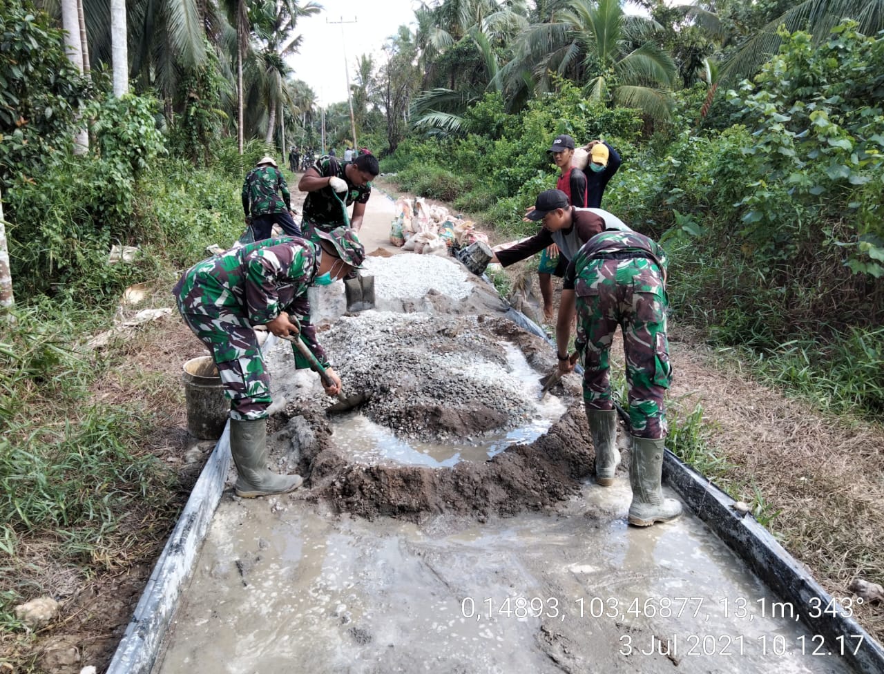 SERIBUPARITNEWS.COM, PELANGIRAN - Untuk Personil Koramil 10/Pelangiran Guna Membantu Satgas TMMD Ke -111 diatur jadwal sesuai Hari, Tepat Hari ini Babinsa Koramil 10/Pelangiran Serda Dodi Eka putra melanjutkan gotong royong bersama warga semenisasi jalan di Desa Teluk Bunian Kecamatan Pelangiran ,Kab.Inhil Sabtu (03/07/2021)