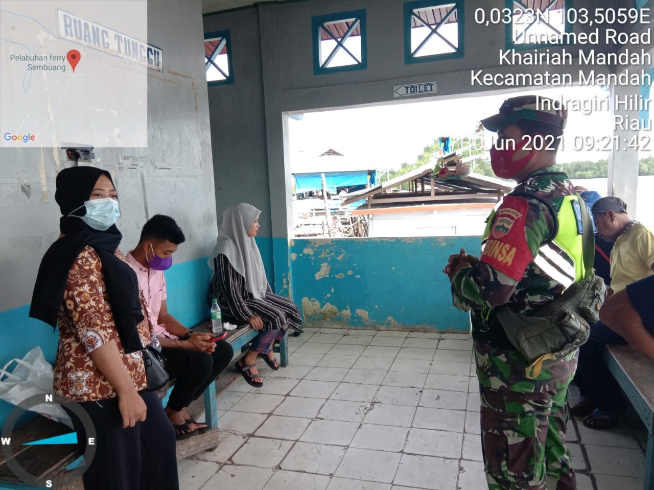 SERIBUPARITNEWS.COM, MANDAH -  Babinsa Koramil 08/Mandah Serda Erik A.Sibarani melaksanakan penegakan protokol kesehatan kepada penumpang yang hendak pergi ke suatu tujuan  di pelabuhan  Sembuang (30/06/2021)