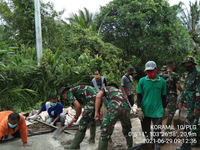 SERIBUPARITNEWS.COM, PELANGIRAN - Di Hari Ke -14 ini Babinsa Koramil 10/Pelangiran  Serma Sri wahyono masih melanjutkan semenisasi jalan bersama  warga di Desa Terusan beringin jaya  Kecamatan Pelangiran ,Kab.Inhil Selasa (29/06/2021)