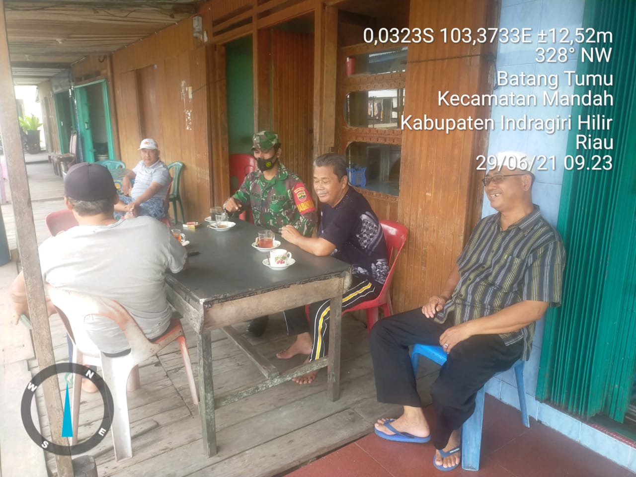 SERIBUPARITNEWS.COM,MANDAH - Disaat Cofee Morning santai, Babinsa Koramil 08/Mandah Serda Tulus L.Gaol melaksanakan komsos bersama tomas dan toga di salah satu sudut kedai dan warung kopi di Pasar Tokolan Desa Batang Tumu Kecamatan Mandah Selasa (29/06/2021)