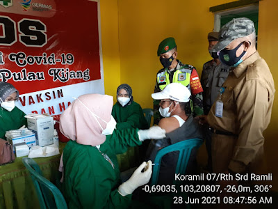 SERIBUPARITNEWS.COM,PULAU KIJANG RETEH -  Proses vaksinasi covid-19 di wilayah kodim 0314/Inhil  Koramil 07 /Reteh Babinsa Serda Ramli  mendampingi suntik vaksin massal di puskesmas pulau kijang kec Reteh kab inhil. Senin 28 Juni 2021