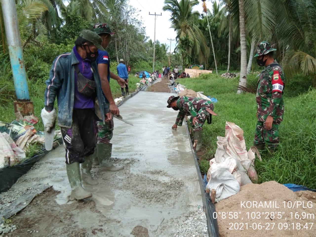 SERIBUPARITNEWS.COM, PELANGIRAN - Di Hari Minggu ini  Babinsa Koramil 10/Pelangiran  Serma Sri wahyono bersama satgas dan warga tetap mengejar target semenisasi jalan  Minggu (27/06/2021)
