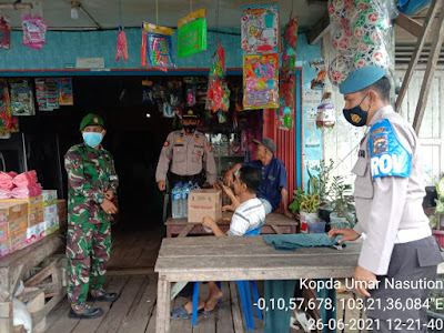 SERIBUPARITNEWS.COM, GAUNG ANAK SERKA - Babinsa Koramil 05/Gas Kodim 0314/Inhil Kopda Umar nasution   melaksanakan penegakan disiplin  protokol kesehatan  kepada warga pengunjung Toko di pasar Teluk Pinang Kecamatan Gas Sabtu  (26/06/2021)