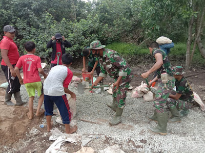 Melaksanakan semenisasi jalan  dalam rangka TMMD KE 111 bersama warga di Desa Terusan Beringin jaya  Kecamatan Pelangiran ,Kab.Inhil