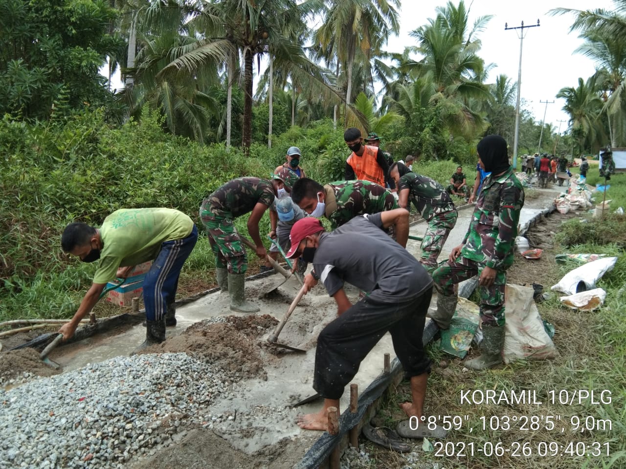 SERIBUPARITNEWS.COM, PELANGIRAN - Di Hari Sabtu ini  Babinsa Koramil 10/Pelangiran  Serma Sri wahyono bersama satgas dan warga tetap mengejar target semenisasi jalan (26/06/2021)