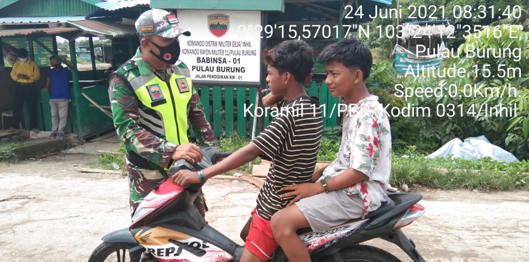 Seperti hari ini Babinsa Koramil 11/Pulau Burung Kodim 0314/Inhil Serda Siswanto melaksanakan Kegiatan Penegakkan disiplin Protokes  Kamis (24/06/2021)