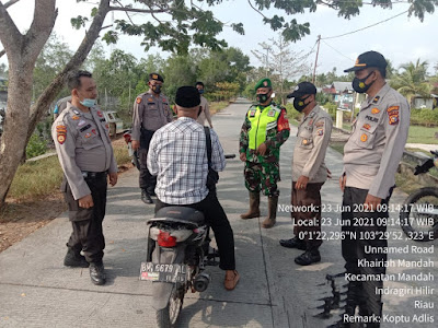 SERIBUPARITNEWS.COM, MANDAH - Babinsa Koramil 08/Mandah dipimpin Koptu Adlis bersama Anggota Polsek Mandah melaksanakan Penegakan disiplin protokol kesehatan covid Rabu (23/06/2021)