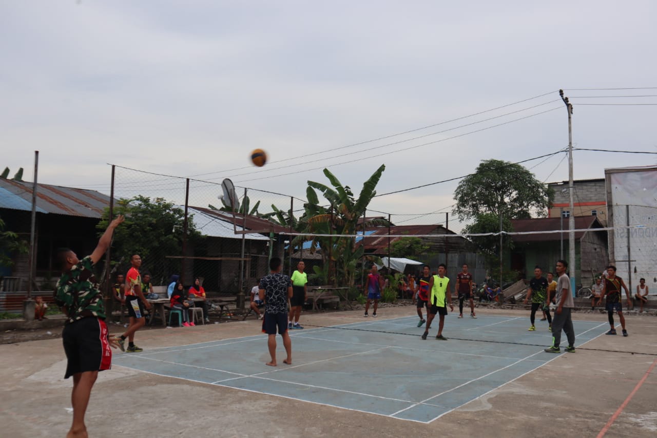 Personil Satgas tampak berbaur dengan muda-mudi melakukan kegiatan olah raga voli, pada Selasa sore (23/06/2021).