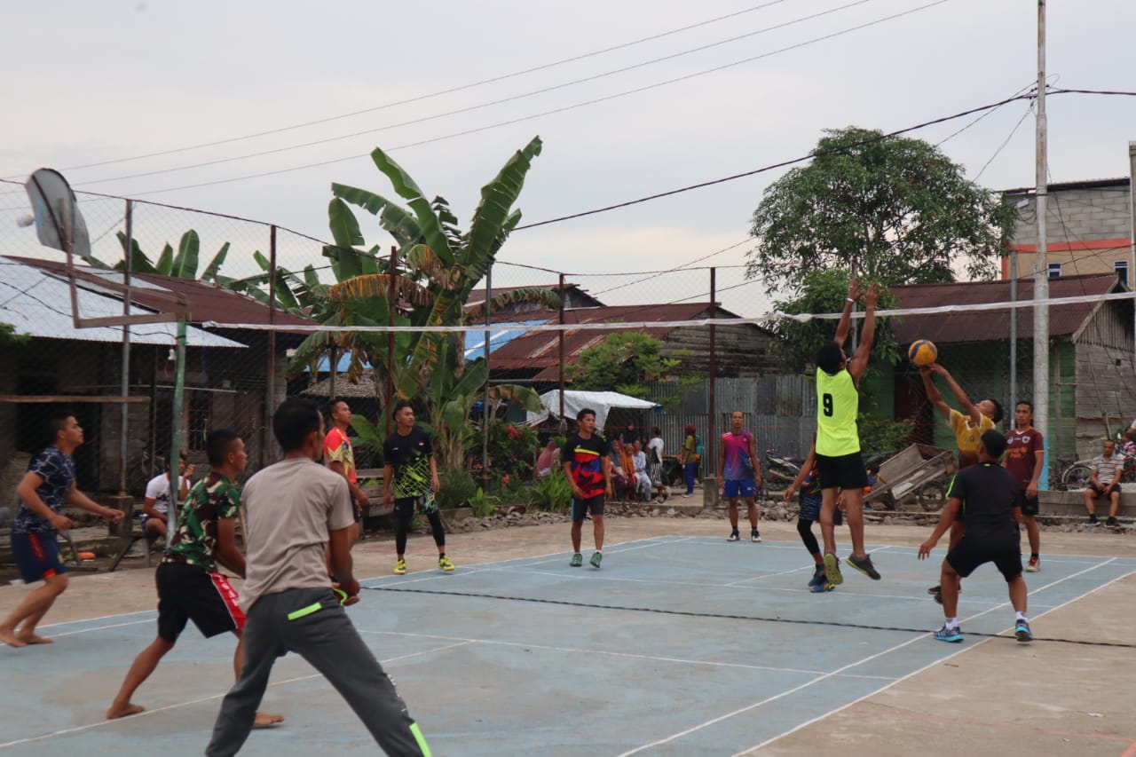 Personil Satgas tampak berbaur dengan muda-mudi melakukan kegiatan olah raga voli, pada Selasa sore (23/06/2021).