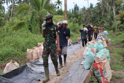 "Mereka bahkan memanfaatkan karung-karung bekas pupuk yang sudah tidak terpakai sebagai alat memindahkan pasir dan batu dari tempat penumpukan material ke lokasi sasaran TMMD," jelasnya.