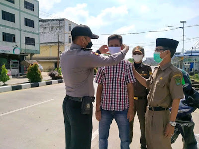Selain memberikan himbauan lurah Tembilahan Hulu membagikan masker secara gratis dan mengenakannya bagi beberapa pengendara bermotor yang tidak memakai masker