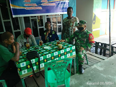 SERIBUPARITNEWS.COM,MANDAH - Di saat coffee Morning,  Babinsa Koramil 08/Mandah Serma M.Darmansyah melaksanakan kegiatan komsos bersama warga di salah satu kedai kopi di Desa Belaras Kecamatan Mandah Senin (21/06/2021)