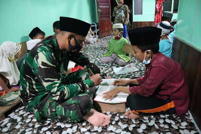 Setiap malam sejumlah anggota Satgas TMMD ke-111 yang bertugas di Desa Teluk Bunian, mengajarkan cara membaca Al-Quran yang baik dan benar di rumah ketua RW, Usman.