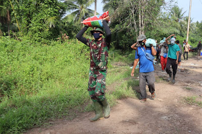 Tidak menjadi halang bagi Personil satgas, mereka tetap semangat menyelesaikan pekerjaan y