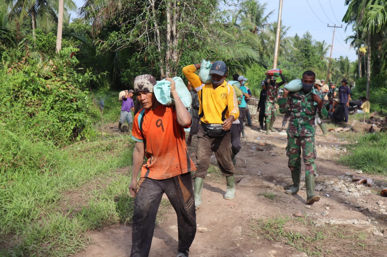 SERIBUPARITNEWS.COM, PELANGIRAN - Dan Satgas Kapten Inf R.Sagala TMMD Ke - 111 di Desa Teluk Bunian Kecamatan Pelangiran  Minggu 20 Juni 2021 dan anggota Kodim 0314/Inhil bersama masyarakat yang bergotong royong dalam pelaksanaan TNI Manunggal Dengan Rakyat