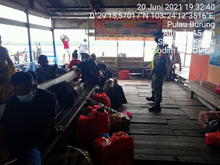 SERIBUPARITNEWS.COM, PULAUBURUNG - Di Sudut Pelabuhan Bod KM 00 Babinsa Koramil 11/Pulau Burung  Serda Siswanto tetap Melaksanakan Penegakkan disiplin  Protokol Kesehatan Minggu (20/06/2021)