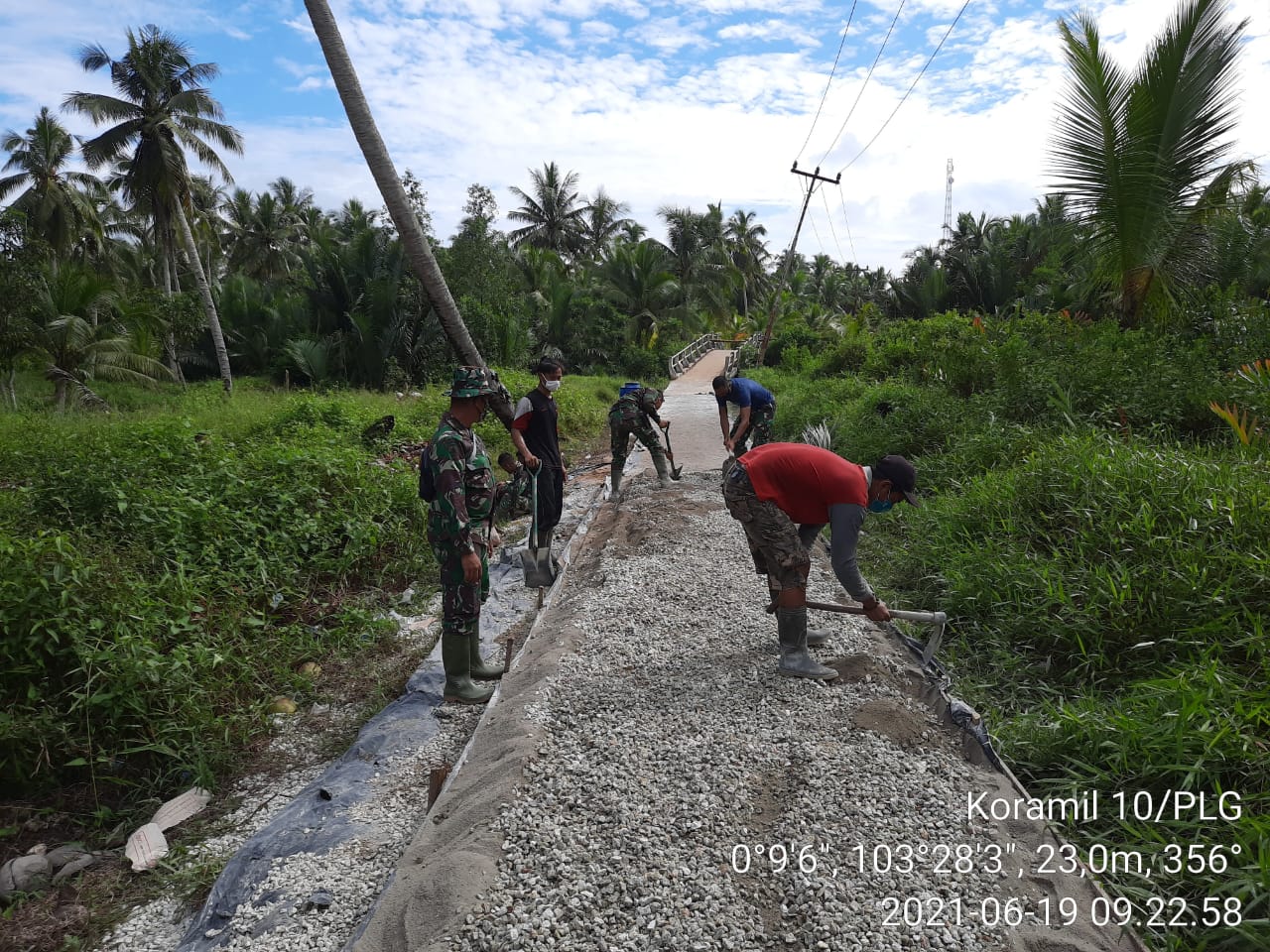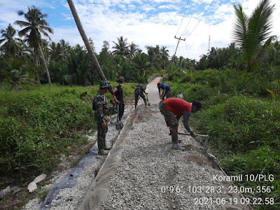 SERIBUPARITNEWS.COM,PELANGIRAN - Sudah mamasuki hari keempat sejak Program TMMd Ke -111 digulirkan, Babinsa Koramil 10/Pelangiran Kopda Dodimen bersama Satgas terus bersinergi dalam pembangunan semenisasi jalan Sabtu (19/06/2021)