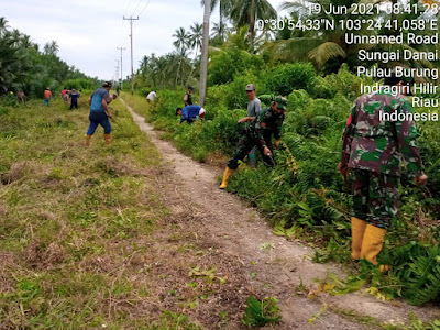 SERIBUPARITNEWS.COM, PULAUBURUNG - Anggota Koramil 11/Pulau Burung Kodim 0314/Inhil  Praka Dedi Hariyawan  dan 1 Babinsa melaksanakan Kegaitan Gotong royong pembersihan jalan Sabtu (19/06/2021)