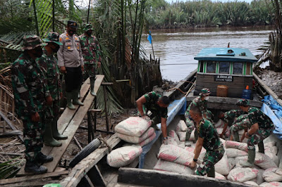 Danki SSK Satgas TMMD Kapten Inf R.Sagala meninjau langsung Pemindahan bahan material dari kapal ke tempat Lokasi fisik pembangunan jalan