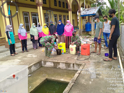 SERIBUPARITNEWS.COM, PELANGIRAN - Babinsa Koramil 10/Pelangiran Serka Sugianto melaksanakan kegiatan penyemprotan desinfetan bersama warga dan Ibu ibu PKK Minggu (13/06/2021)