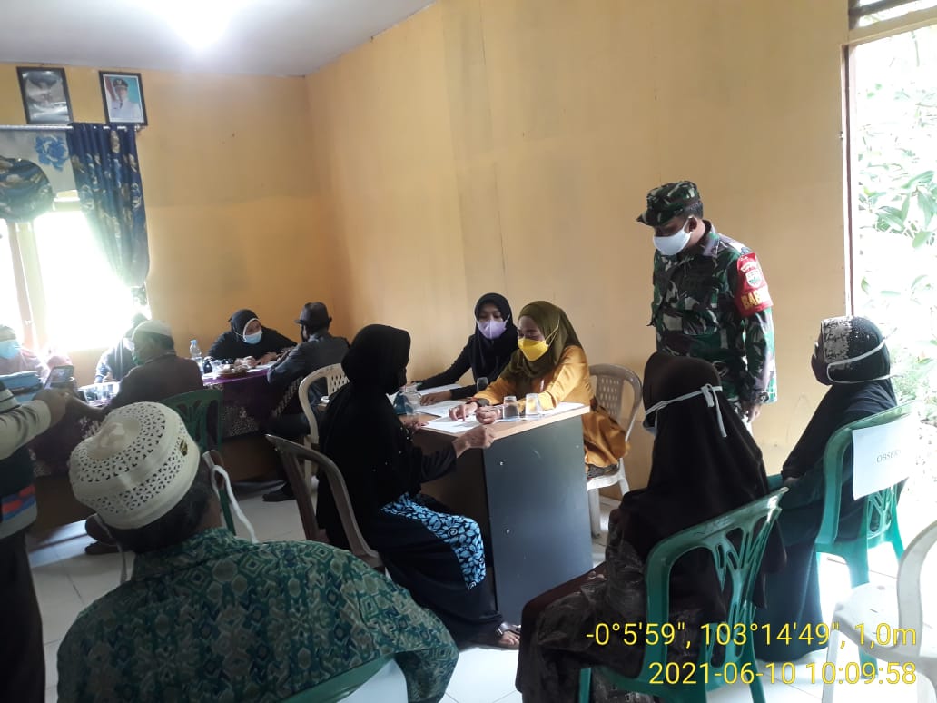 Babinsa mengawasi pelaksanaan vaksinasi agar berjalan lancar dan sesuai protokol kesehatan yang berlaku