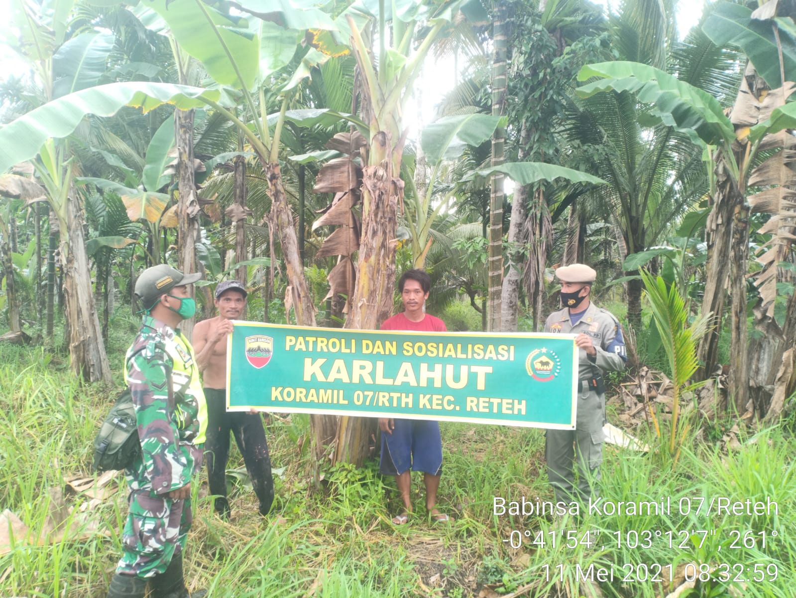 Babinsa Serda Wahyudin rutin melaksanakan kegiatan patroli dan sekaligus sosialisasi tentang Karhutla kepada masyarakat yang berada di wilayah binaan, Kelurahan Pulau Kijang kecamatan Reteh.Selasa(11/05/2021).