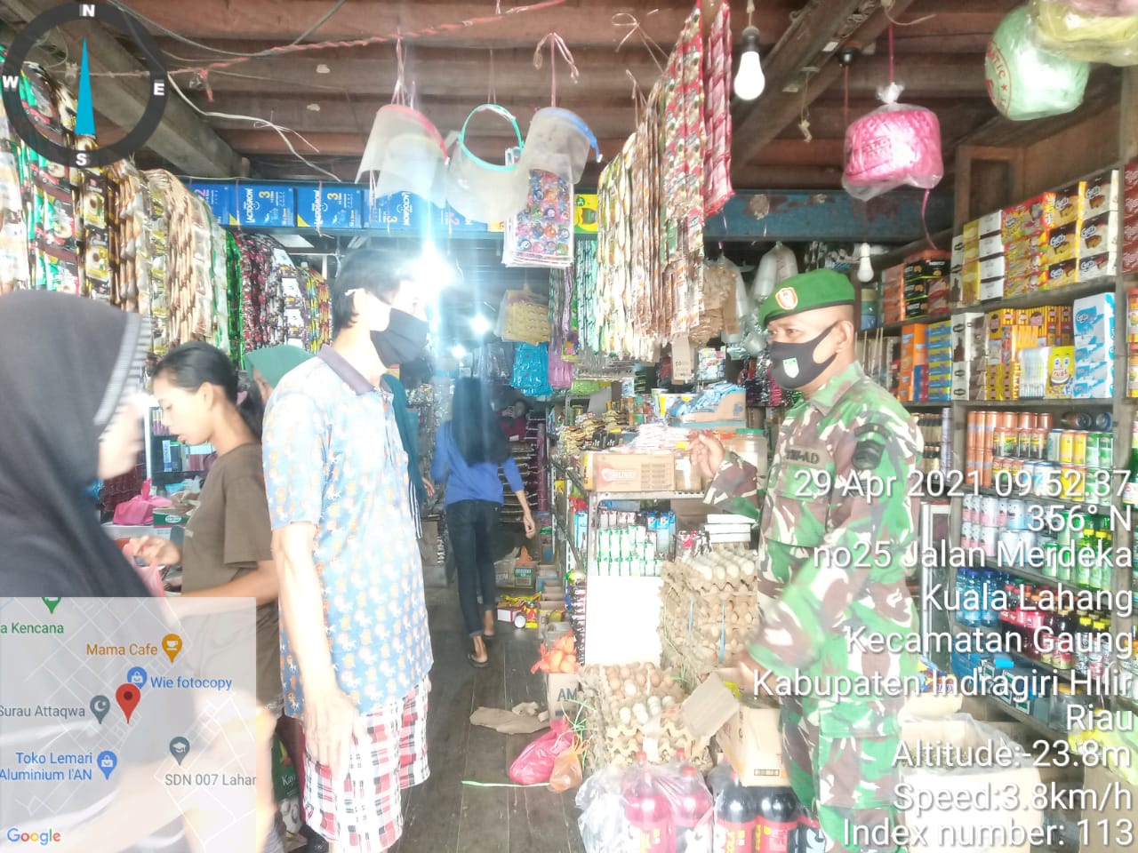 SERIBUPARITNEWS.COM, GAUNG ANAK SERKA - Babinsa koramil 05/Gas Kodim 0314/Inhil  Serma Tota melaksanakan penegakan disiplin  protokol kesehatan di kelurahan kuala lahang Kamis (29/04/2021)