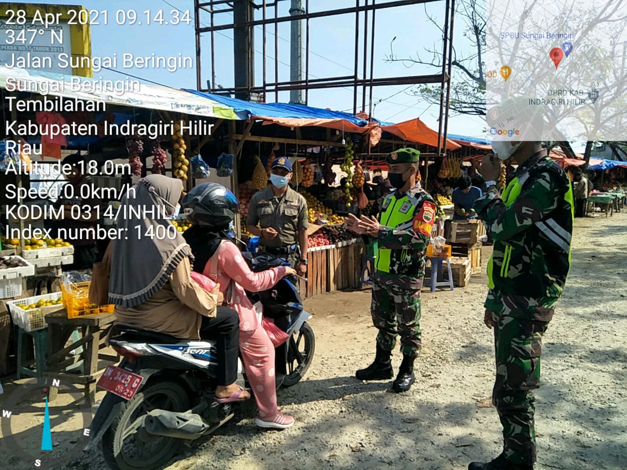Sertu Zulfahfi Babinsa Koramil 01/Tembilahan Kodim 0314/Inhil Tegakkan disiplin terpadu protokol kesehatan di Simpang 4 Sungai Beringin.