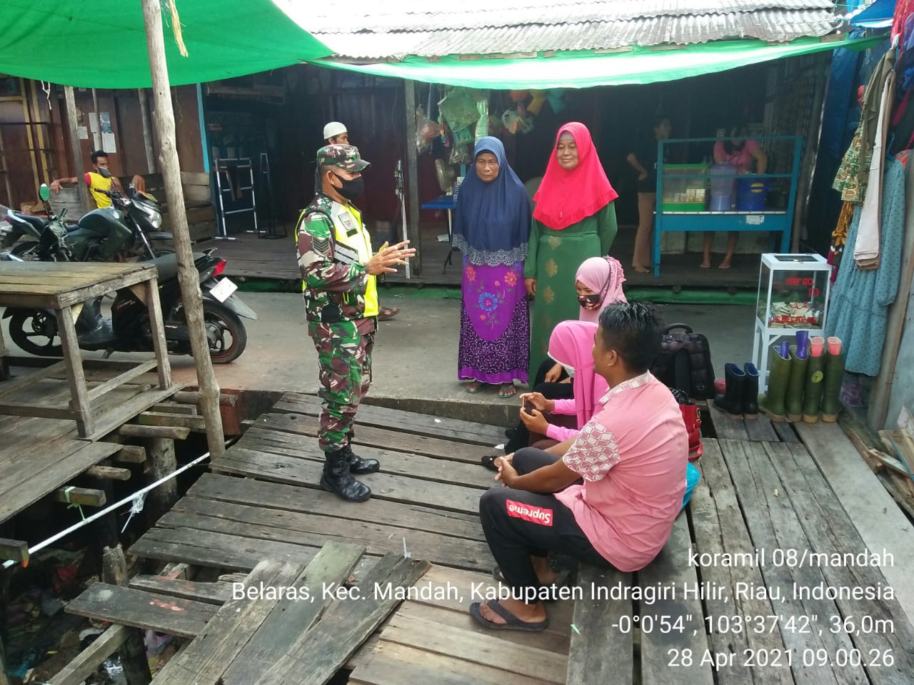 Babinsa menghimbau kepada warga tidak berkumpul ketika hendak berbelanja di pasar belaras Desa Belaras Kecamayan Mandah Kab.Inhil.